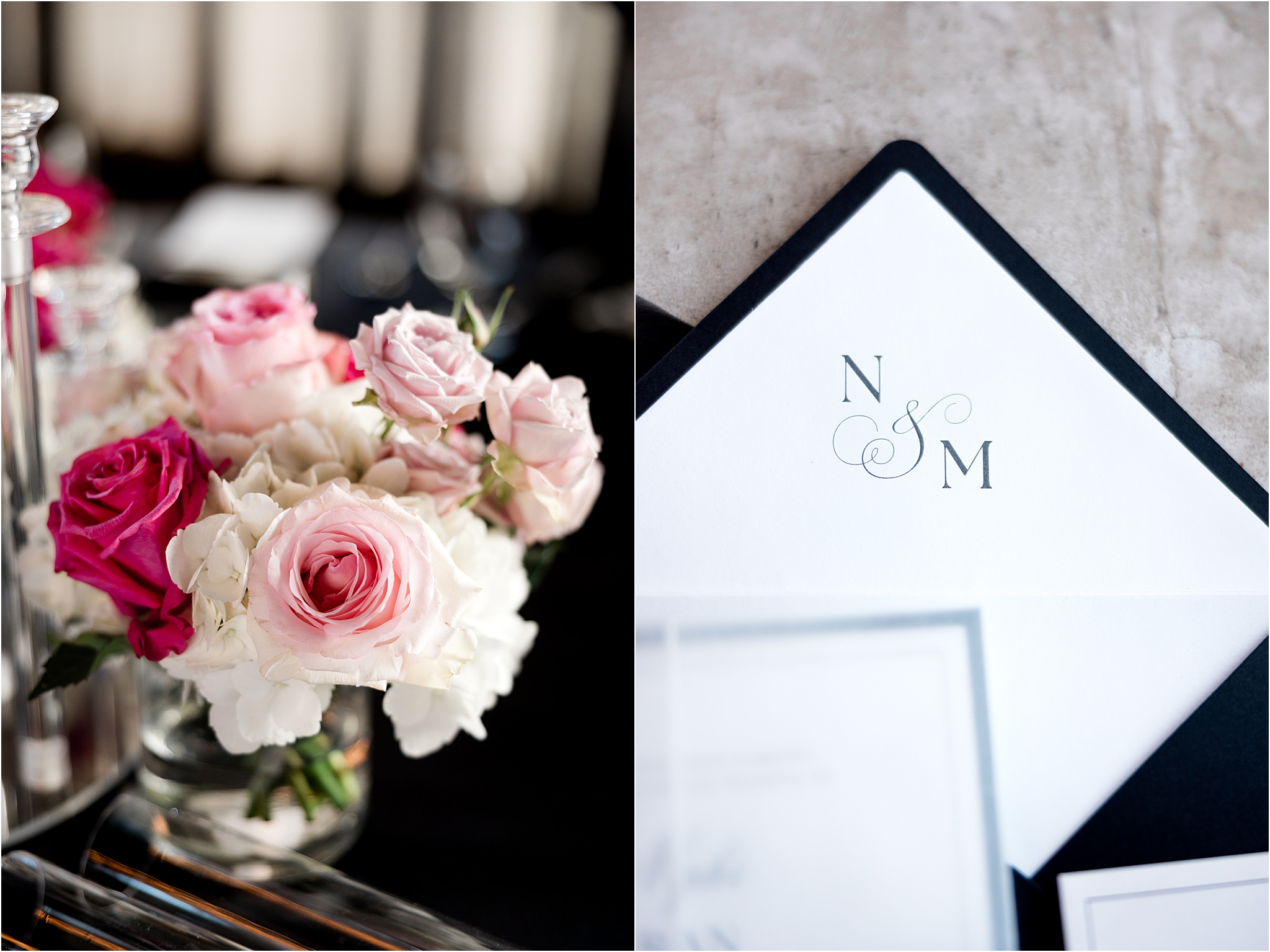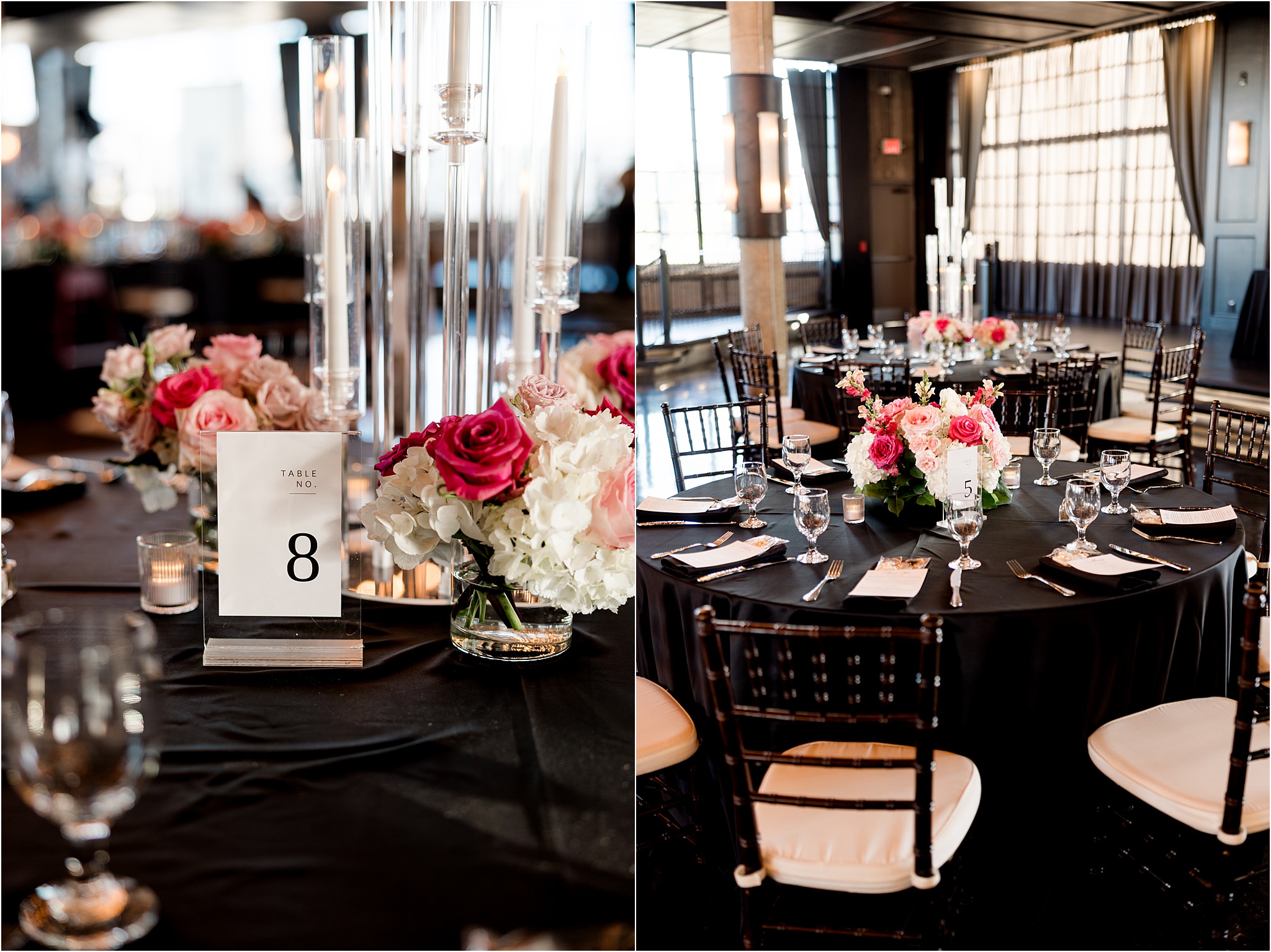 The Astorian provided a stunning backdrop with its industrial-chic architecture, soaring windows, and panoramic views of the Houston skyline. The space was transformed into a luxurious dreamscape, where classic black linens anchored each table and created a bold, sophisticated contrast against the soft, romantic hues of ombre pink florals. The floral design flowed effortlessly from blush to deeper rose tones, adding dimension and warmth while enhancing the overall dramatic atmosphere of the evening.